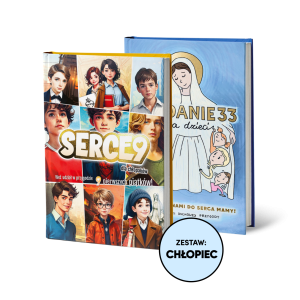 Zestaw prezentowy dla chłopca z okazji Pierwszej Komunii Świętej. W skład zestawu wchodzą dwie książki w twardej oprawie Oddanie33 dla dzieci i Serce9 dla chłopaków.